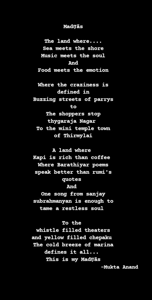 TO COMMEMORATE CHENNAI DAY ON AUGUST 22ND, 2020 OUR CENTRE STUDENT MUKTA ANAND HAS PENNED THIS POEM .THIS POEM STRIKES A CHORD IN THE HEARTS OF THOSE WHO LOVE TAMILNADU’S CAPITAL CITY CHENNAI.