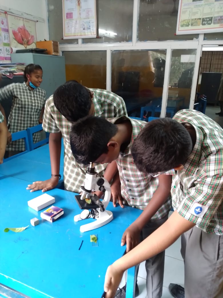 Preparatory II students are seeing slides of Xylem and Phloem; Stomata in leaves under the microscope. Modifications of the Stems and Roots of plants are being explained in detail from the given chart.