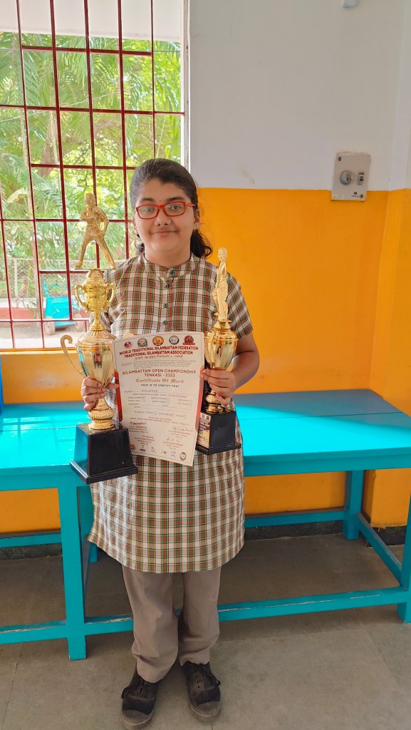 Martial Art Exponent V. Dhevsree! Saraswathi Kendra Learning Centre for ChildrenSeptember 22, 2023Uncategorized Post navigation PreviousNext V. Dhevsree of Senior Secondary I clinched the First prize in Irrattai Kambu Silambattam Open Championship Tenkasi held on 30th July, 2023. She also secured second place in Ottrai Kambu. Wishing her a fabulous journey ahead! Share this: Click to share on X (Opens in new window) X Click to share on Facebook (Opens in new window) Facebook Like Loading... Related